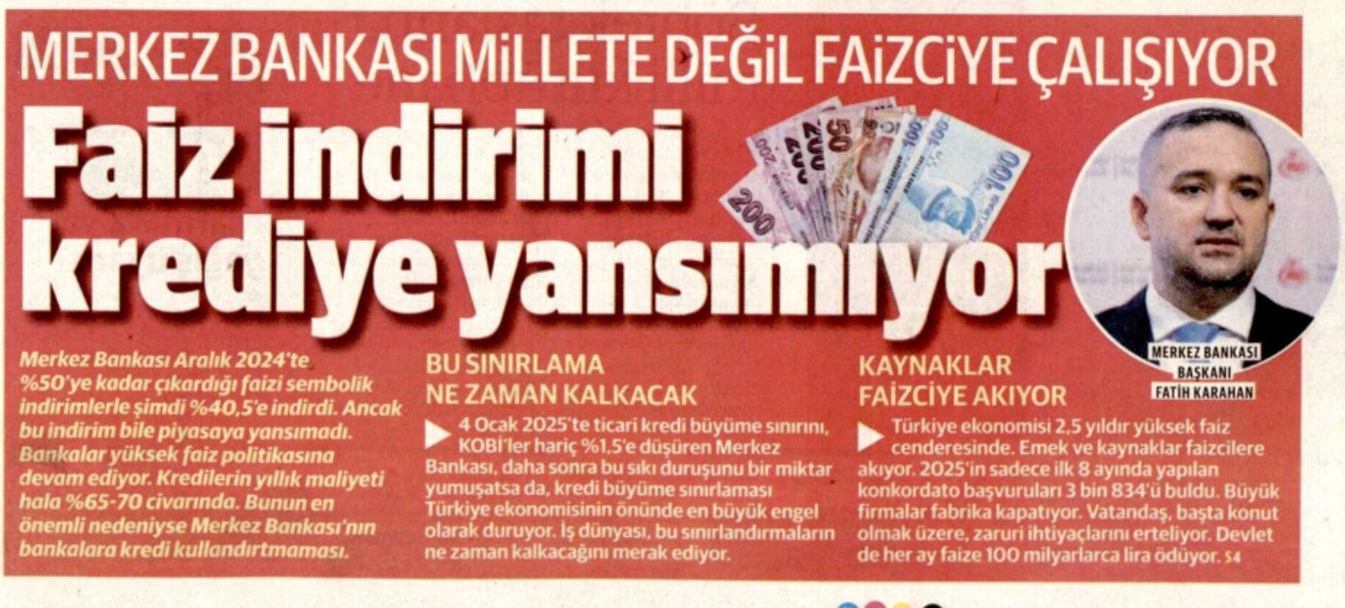 Yeni Şafak’ın ”Merkez Bankası millete değil faizciye çalışıyor: Faiz indirimi krediye yansımıyor” başlıklı haberinde, ”Merkez Bankası Aralık 2024’te %50’ye kadar çıkardığı faizi sembolik indirimlerle şimdi %40,5’e indirdi. Ancak bu indirim bile piyasaya yansımadı. Bankalar yüksek faiz politikasına devam ediyor. Kredilerin yıllık maliyeti hala %65-70 civarında. Bunun en önemli nedeniyse Merkez Bankası’nın bankalara kredi kullandırtmaması” denildi.